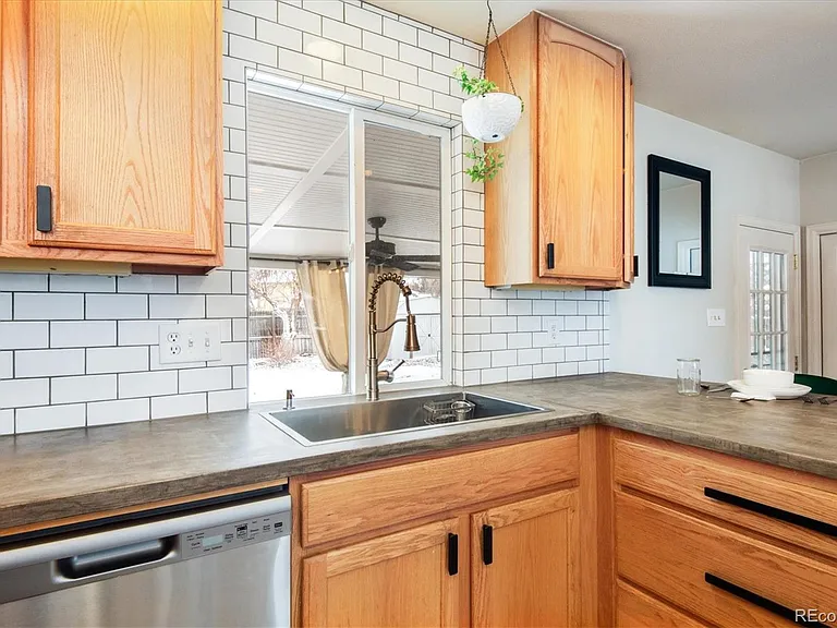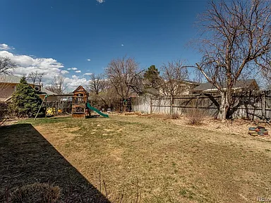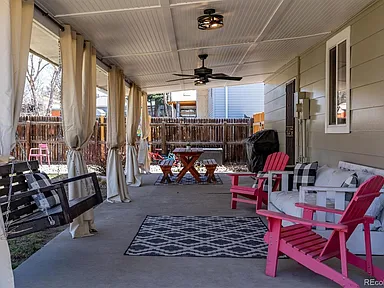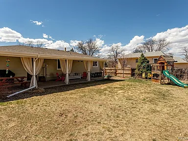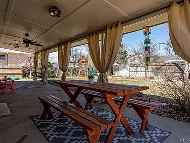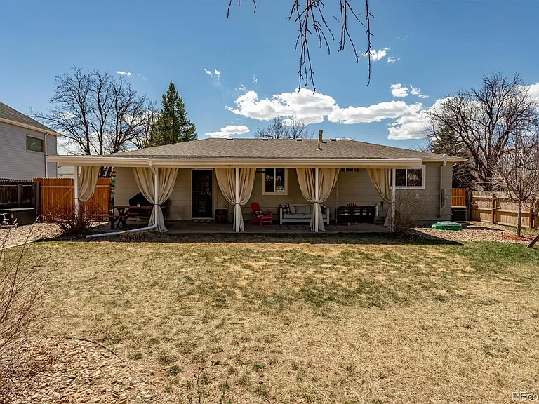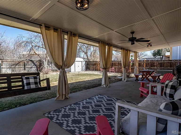 Backyard oasis for exceptional Colorado Outdoor Living! Extra large covered patio, room for projector screen, swing set can stay, private, low maintenance, fenced yard; storage shed, two apple trees, lilac bush!