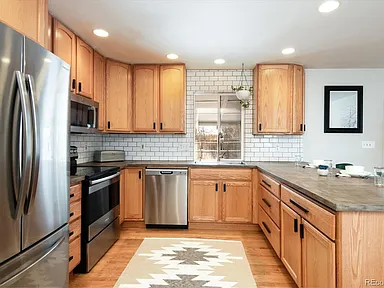 Updated kitchen with 42" upper cabinets, concrete countertops, single basin stainless sink with touch faucet, stainless appliances. Open to cozy living room