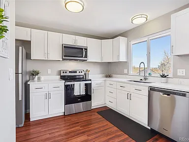 Make yourself at home in this fully remodeled, 3 bed, 1 bath home located minutes from Buckley Air Force Base. This is a perfect starter home, with premium features like quartz countertops, new stainless steel appliances, in-unit washer/dryer, LED lighting, soft-close solid wood cabinets, and brand new carpet/paint throughout the property. There is also plenty of flexible space for entertaining and storage, including a massive deck and substantial workspace and storage in the garage. When you move in, you also have the opportunity to add your own touches to the low-maintenance yard. Finally, this home is well suited for relaxation, with a fireplace and updated master bedroom that includes a walk-in closet. Come see your future home today!