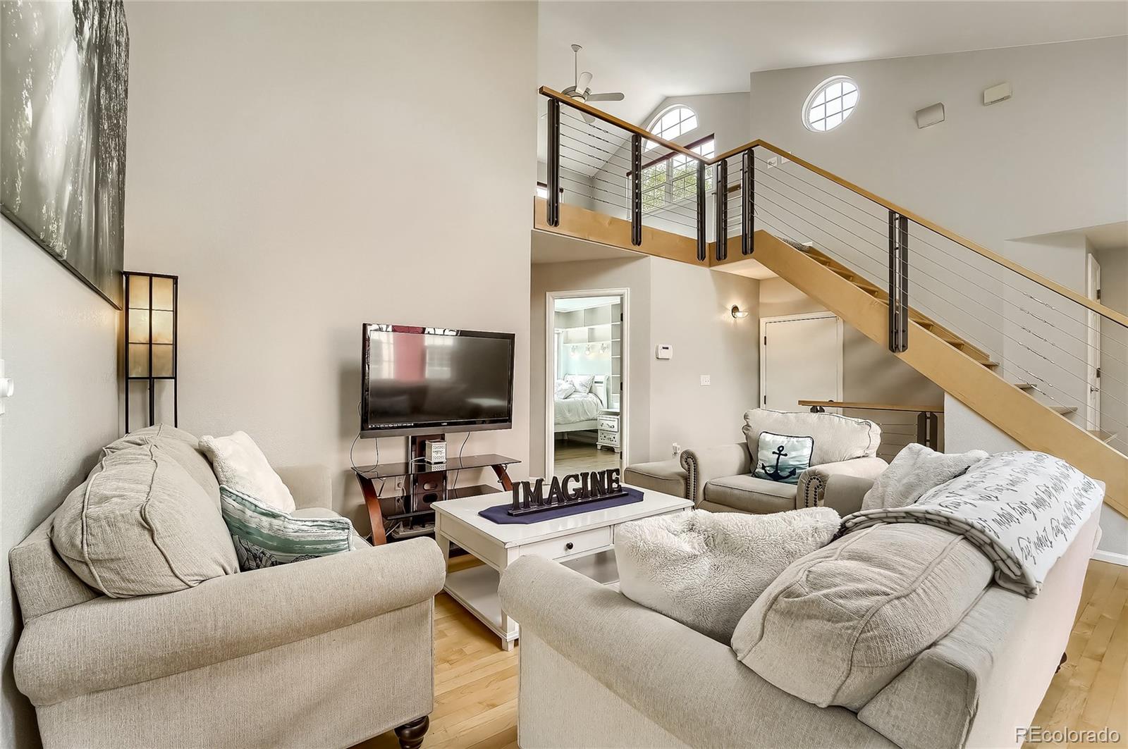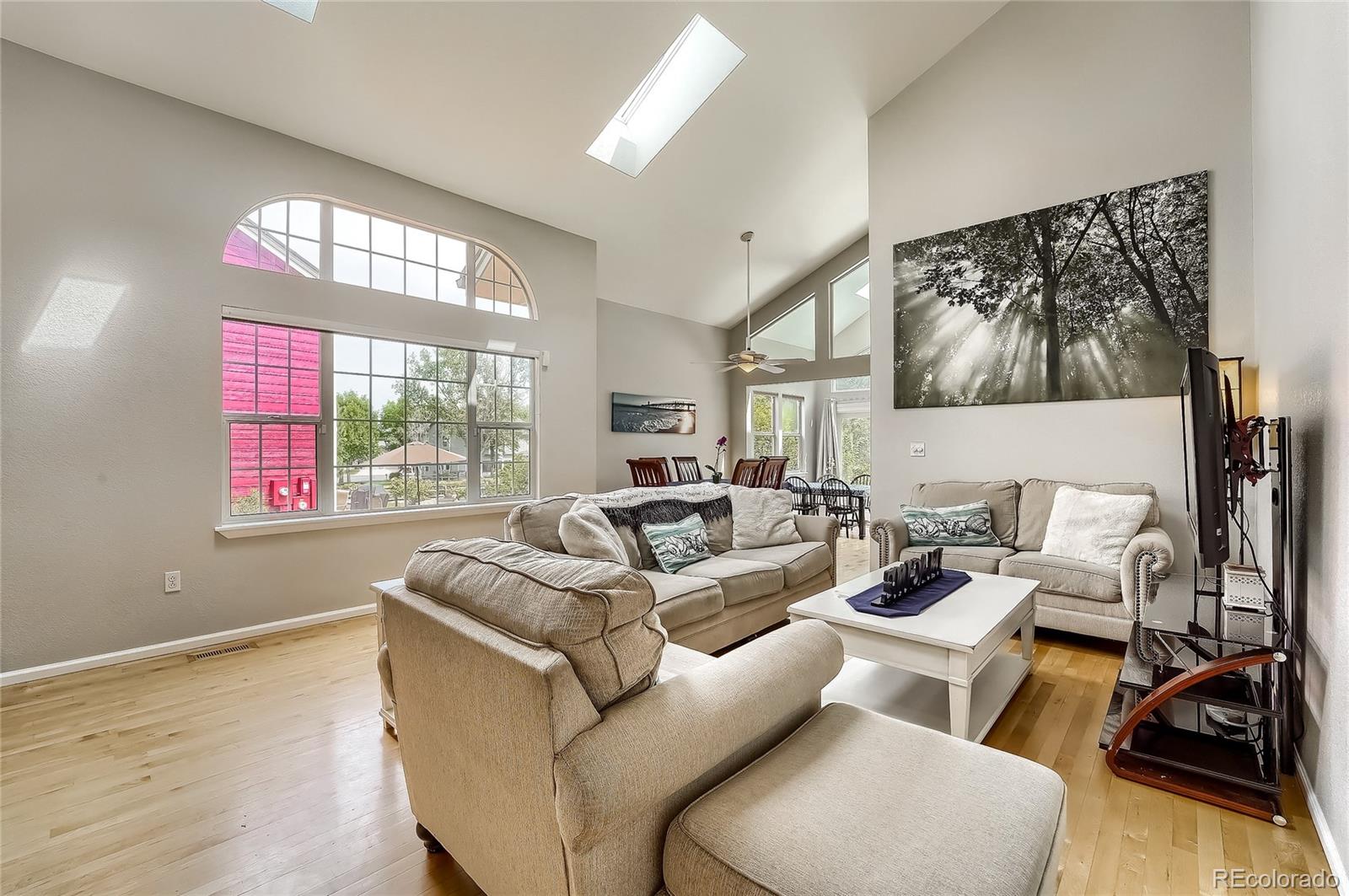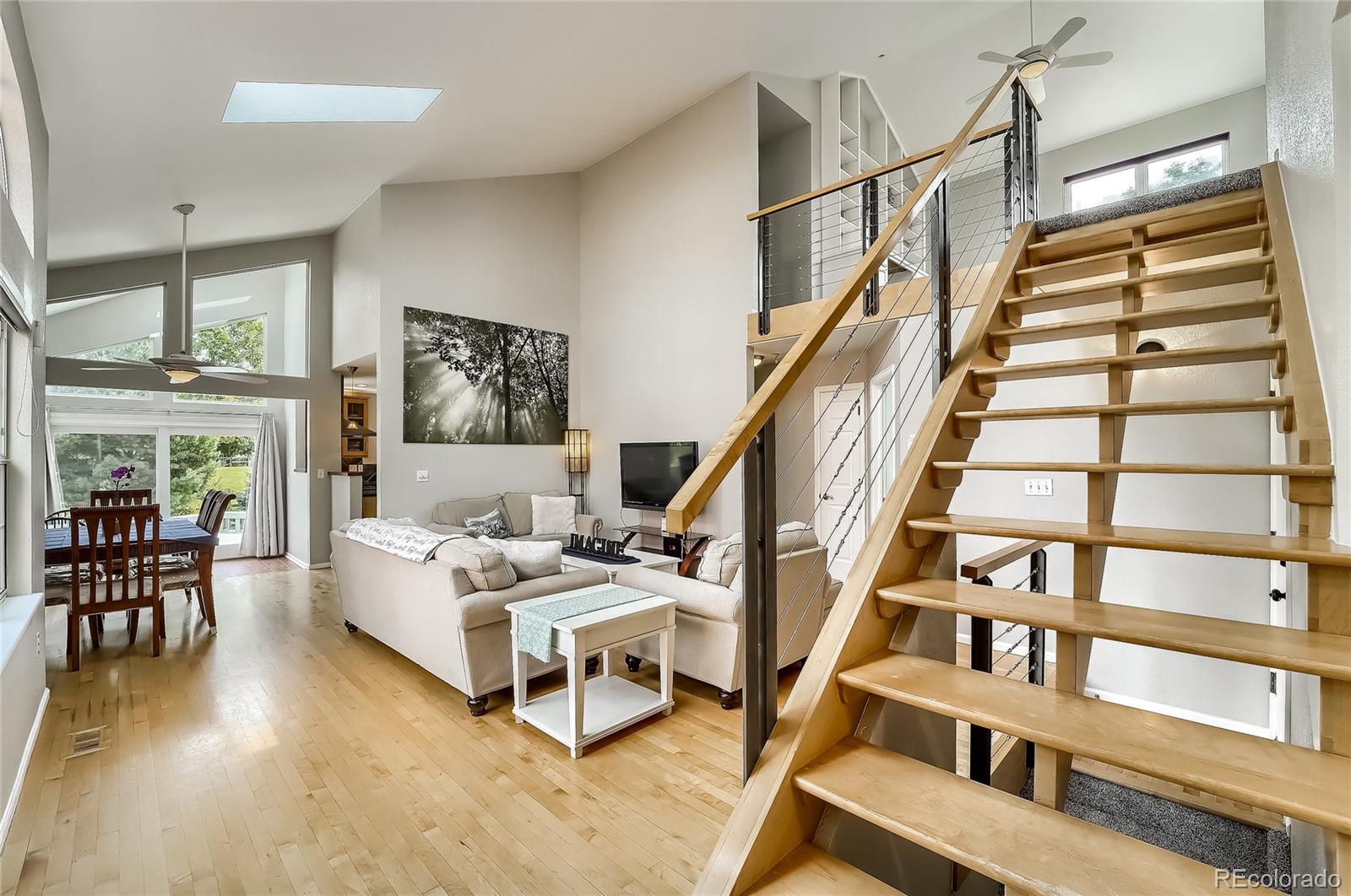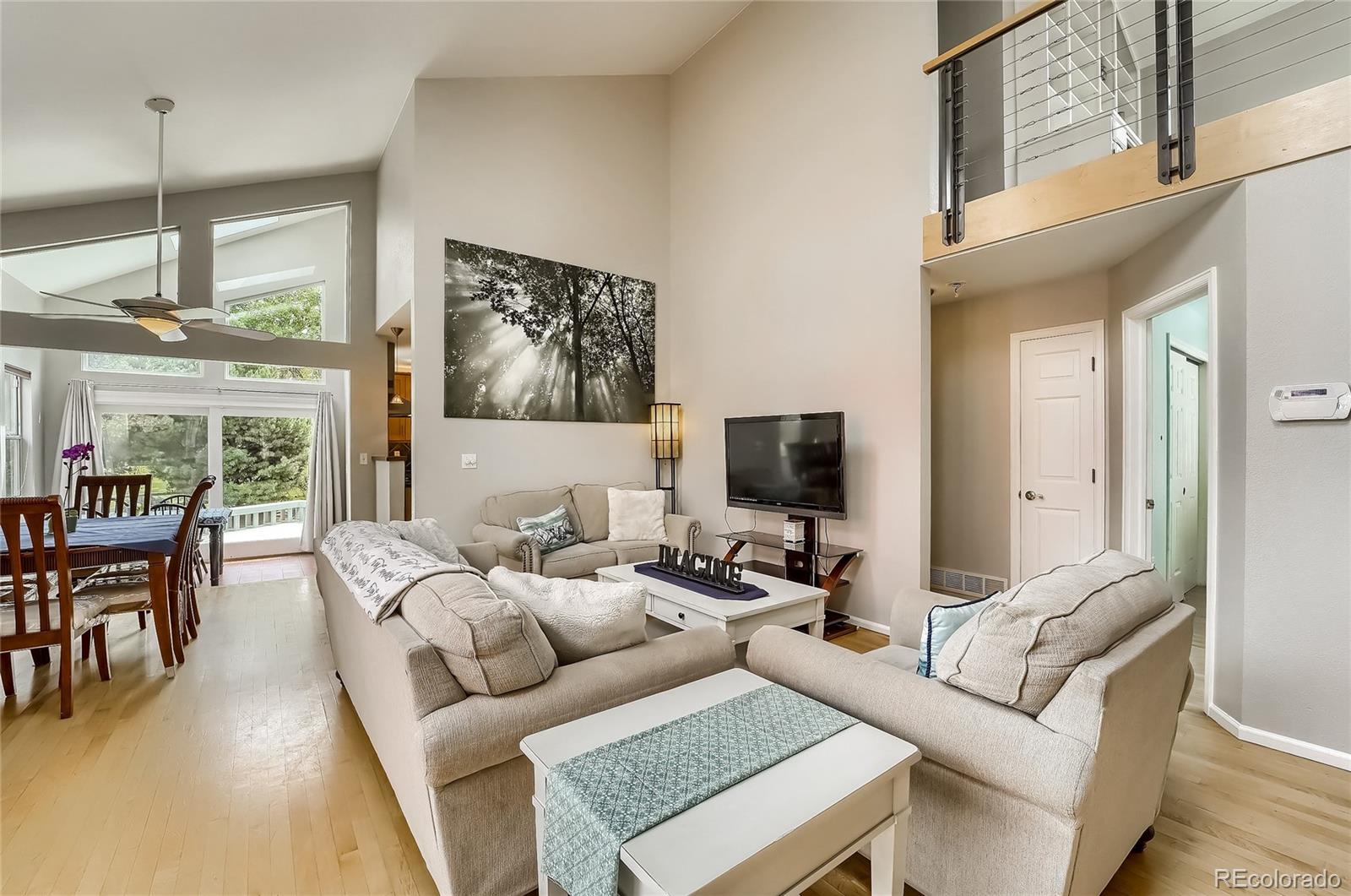 Fantastic Home in sought after Hunter's Glen! Sunlight gleams through the interior bound by cathedral ceilings and an open floor plan. Great sun room perfect for enjoying a cozy meal or cup of coffee with views from the slider to the large outdoor deck surrounded by a professionally landscaped back yard. Home backs to green belt too! Wood floors throughout main level. NEW carpet throughout. NEW Fresh and Stylish interior paint. Large kitchen with wine fridge, stainless steel appliances, easy maintenance Corian tops, and lots of light! Private upper level master bedroom with full master bath including Japanese soaking tub, bamboo cabs, and granite tops. Large loft/office area just outside master perfect for an office or space to relax. Contemporary cable railings lead you down to the main level where you find two bedrooms and full bath. Separate dining area next to sun room. Large Finished basement boasting great sunlight too. Additional bedroom and full bathroom make this a great guest area or private area. Large two car garage with additional shop area. Check out the back yard as it is private with lots of great areas to sit and read/relax covered by shade trees.