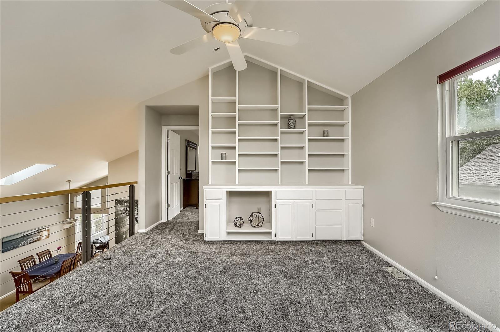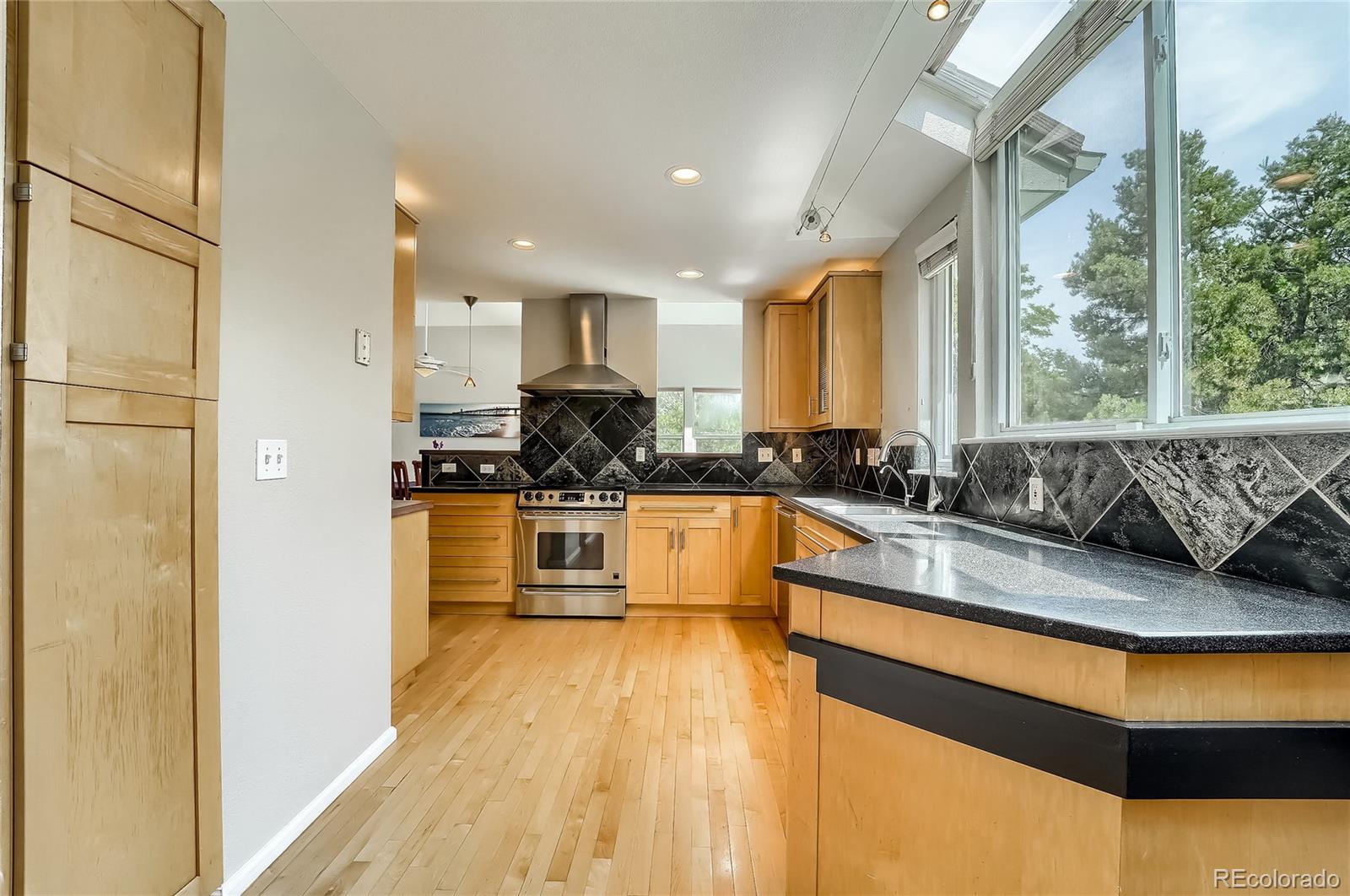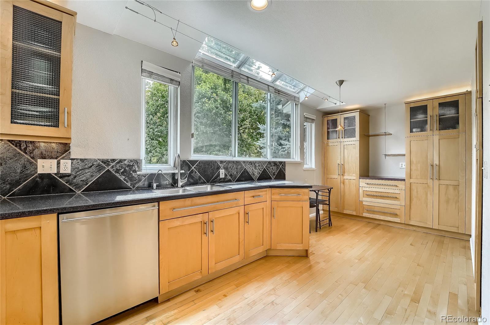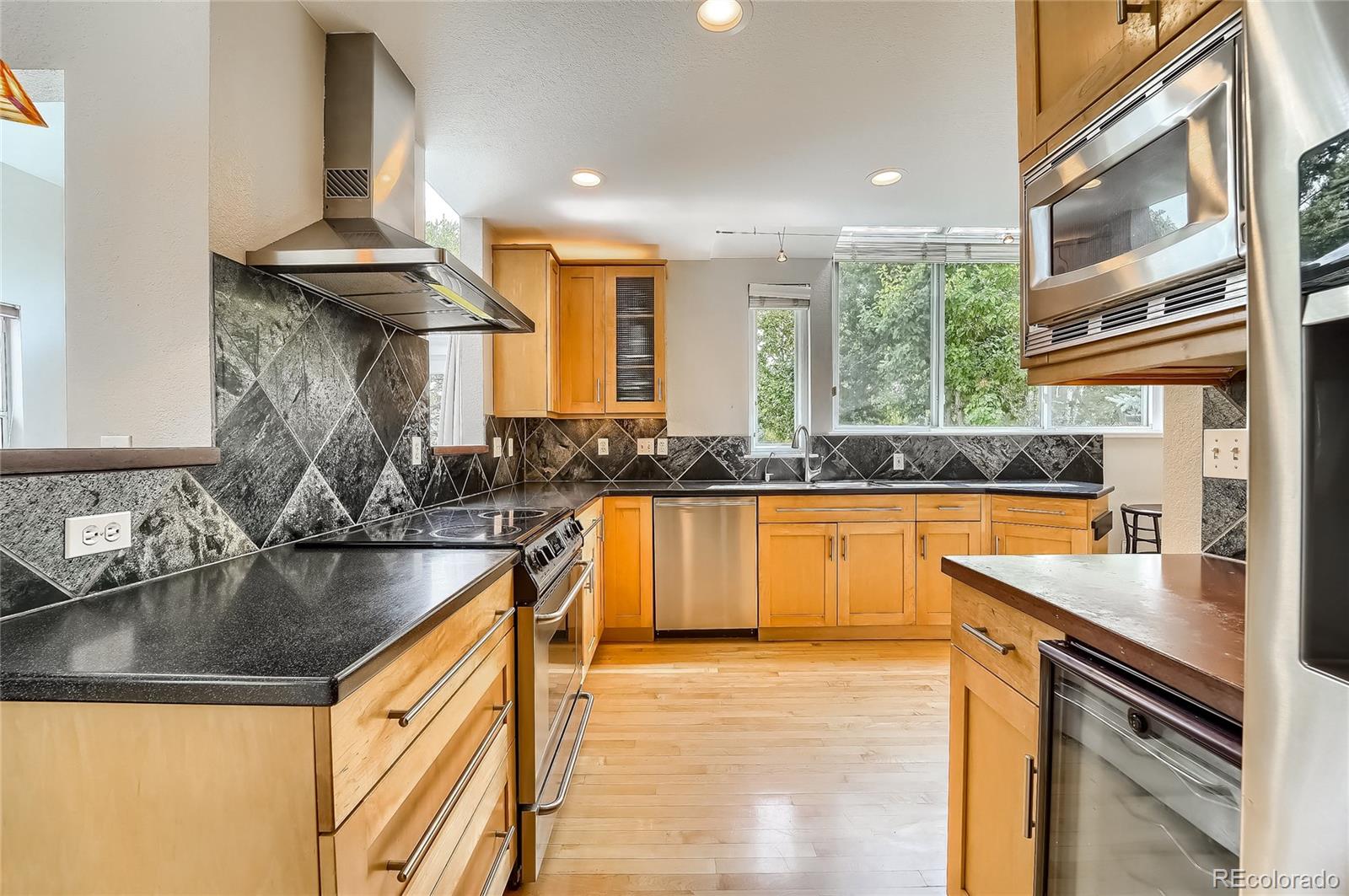Fantastic Home in sought after Hunter's Glen! Sunlight gleams through the interior bound by cathedral ceilings and an open floor plan. Great sun room perfect for enjoying a cozy meal or cup of coffee with views from the slider to the large outdoor deck surrounded by a professionally landscaped back yard. Home backs to green belt too! Wood floors throughout main level. NEW carpet throughout. NEW Fresh and Stylish interior paint. Large kitchen with wine fridge, stainless steel appliances, easy maintenance Corian tops, and lots of light! Private upper level master bedroom with full master bath including Japanese soaking tub, bamboo cabs, and granite tops. Large loft/office area just outside master perfect for an office or space to relax. Contemporary cable railings lead you down to the main level where you find two bedrooms and full bath. Separate dining area next to sun room. Large Finished basement boasting great sunlight too. Additional bedroom and full bathroom make this a great guest area or private area. Large two car garage with additional shop area. Check out the back yard as it is private with lots of great areas to sit and read/relax covered by shade trees.