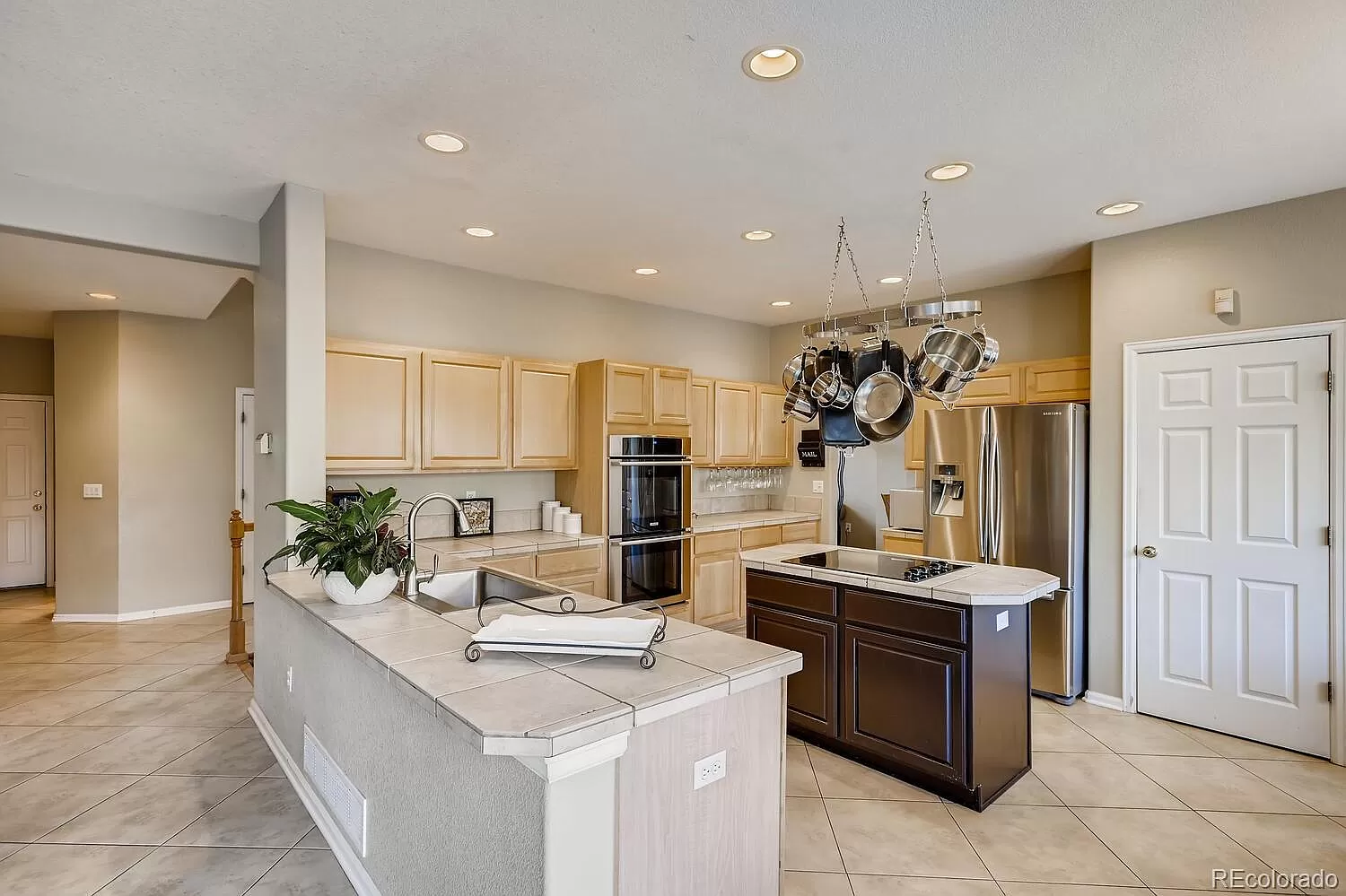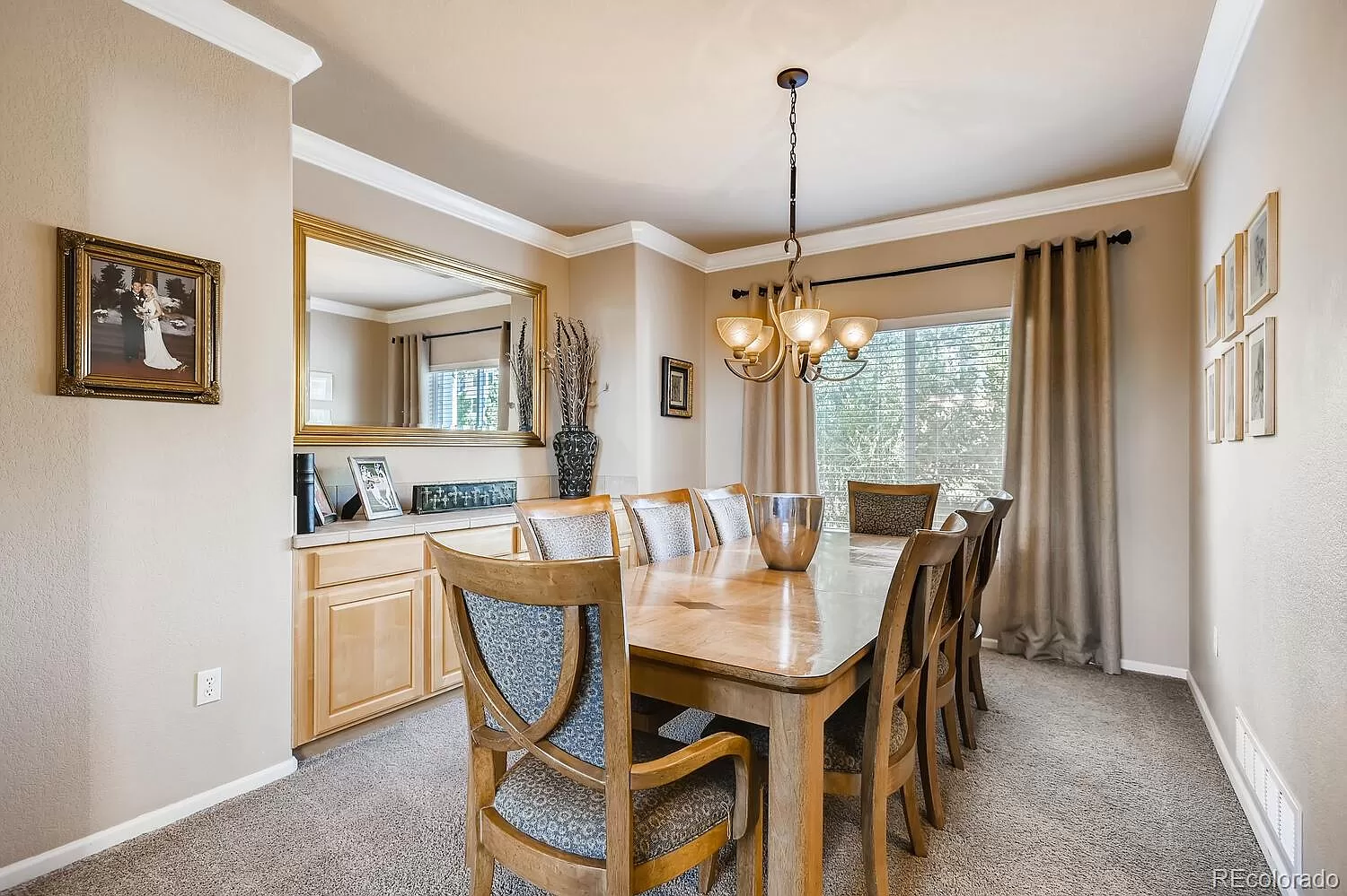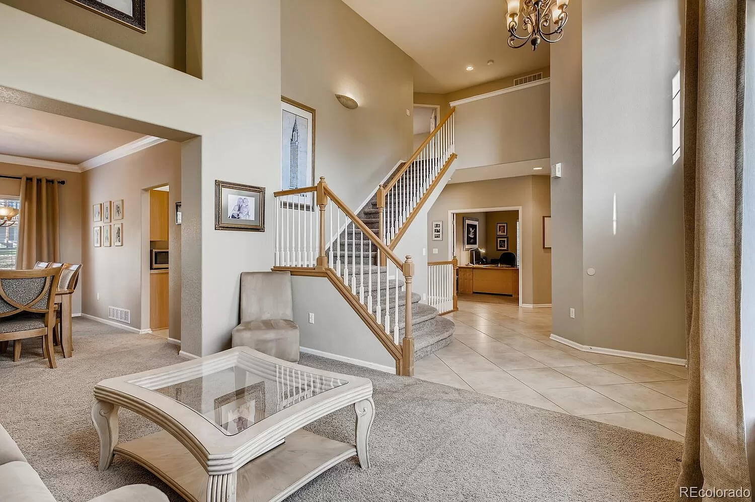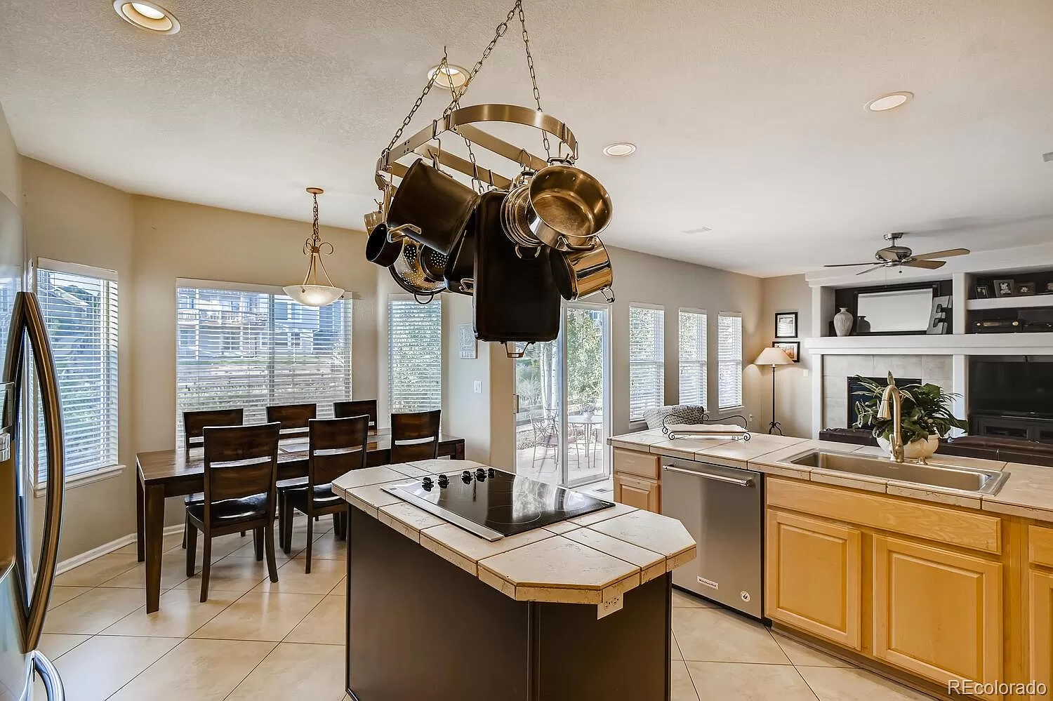 This 5 bedroom, 4 bath home located in the heart of Canterberry Crossing backs to gorgeous open space and trails! The open floor plan has soaring vaulted ceilings and plenty of natural light. The gourmet kitchen features a beautiful bay window and SS appliances. The kitchen opens to the family room with a beautiful fireplace and built-in shelves. The stunning formal dining room has crown molding and a built in buffet. The main floor office can be a 6th bedroom. Upstairs there are 4 bedrooms, including the master suite with a 5 piece bath and walk-in closet. The finished basement includes a bedroom suite with private bath, a bonus room, an exercise room and a wine cellar. Outside, enjoy the beautiful Colorado weather and wildlife from the over-sized patio. Take a short walk to the community pool or bike to downtown Parker on the trails.